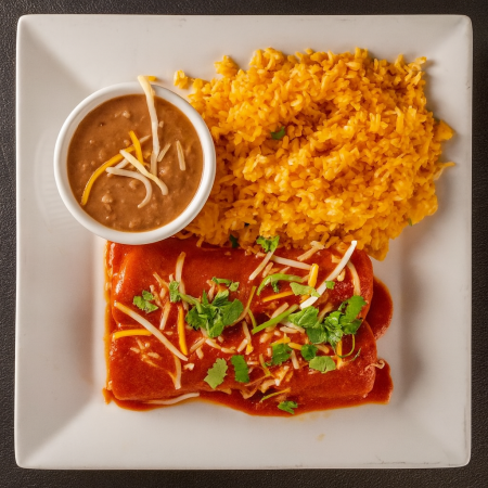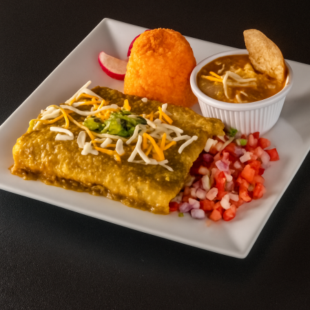 Servidas con guarnicion de lechuga, pico de gallo, queso, salsa, tortillas, arroz, frijoles y crema. Served with lettuce, pico de gallo, cheese, salsa, tortillas, rice, beans and sour cream.
